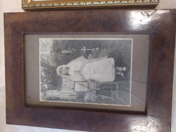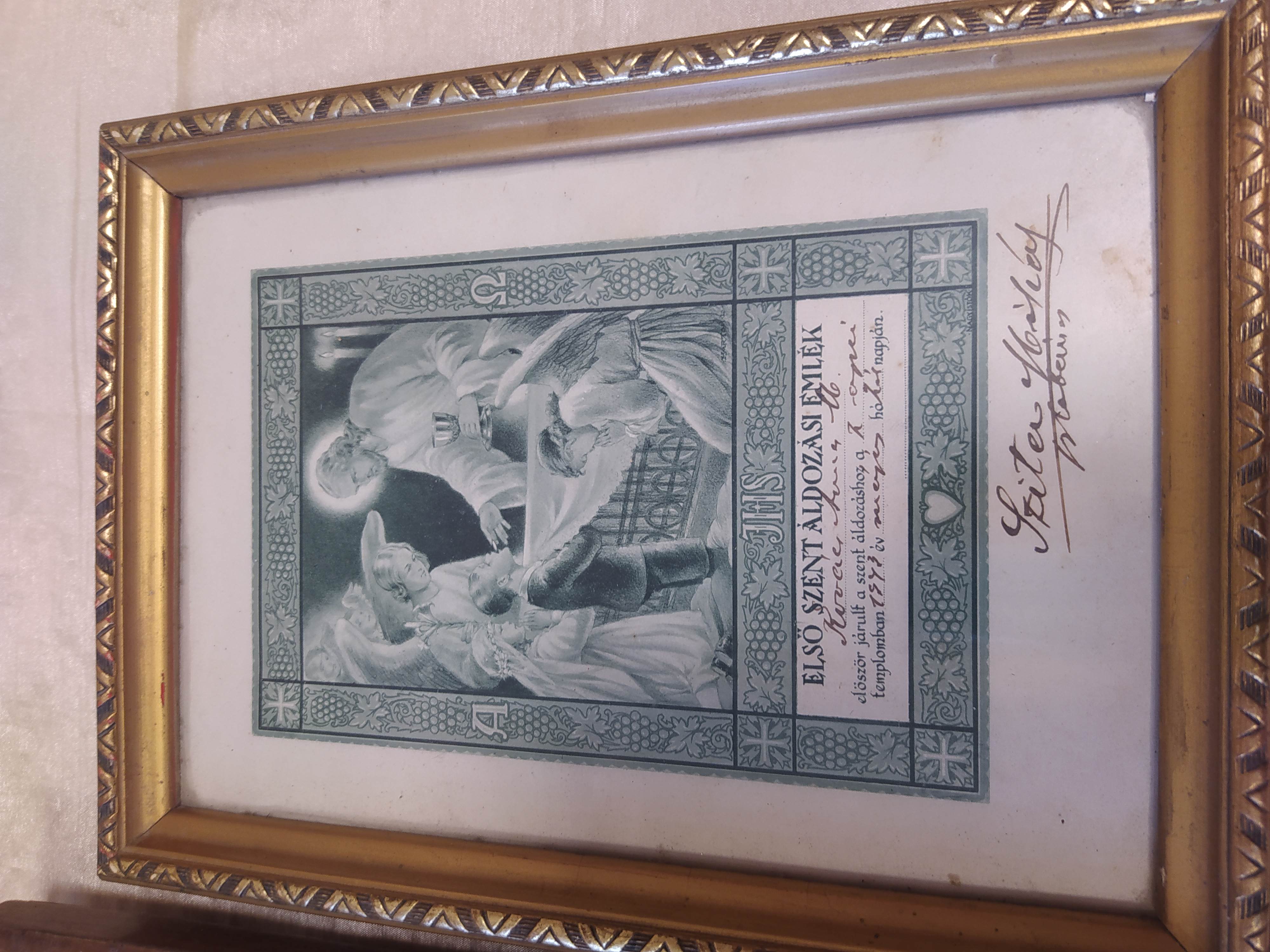 Antik elsőáldozó emlék, képen látható állapotban. 2-részből áll, egy fénykép, és egy bizonylat. A fényképen maga az elsőáldozó lányka látszik, 1973-ból.