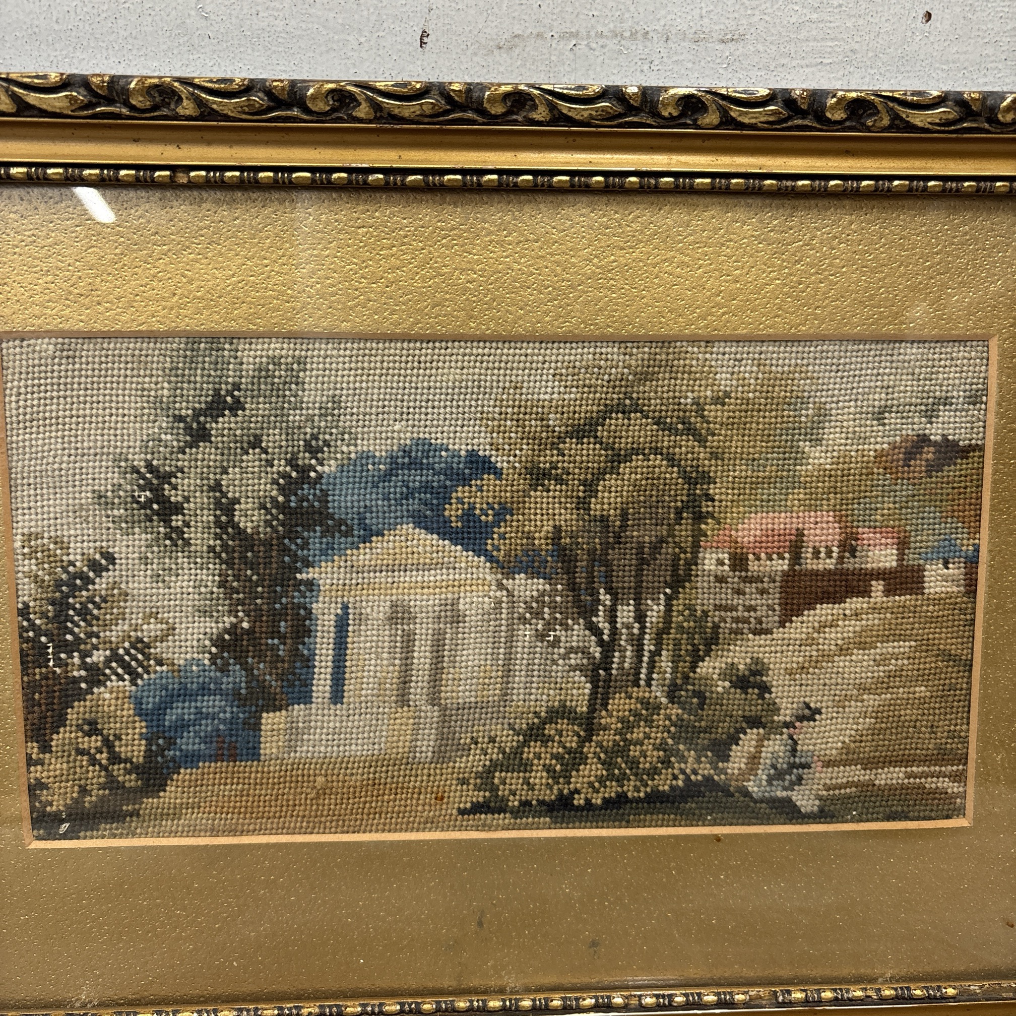 Antik képkeret gobelinnel szép állapotban. Üveggel, paszpartuval, befoglaló mérete 34 x23 cm