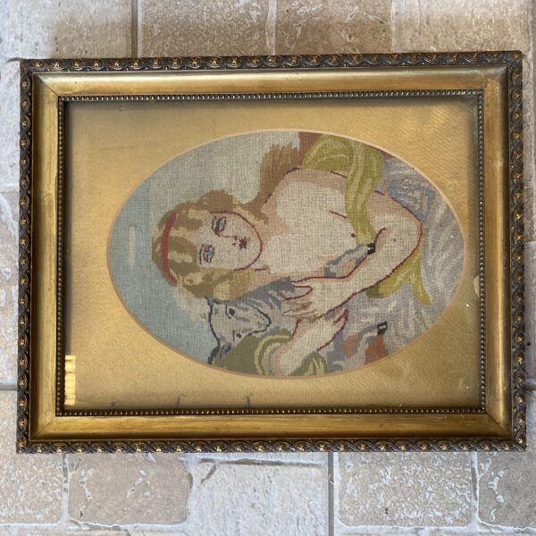 Antik képkeret tű gobelinnel, a keret hibátlan állapotban van, üveg is van hozzá.