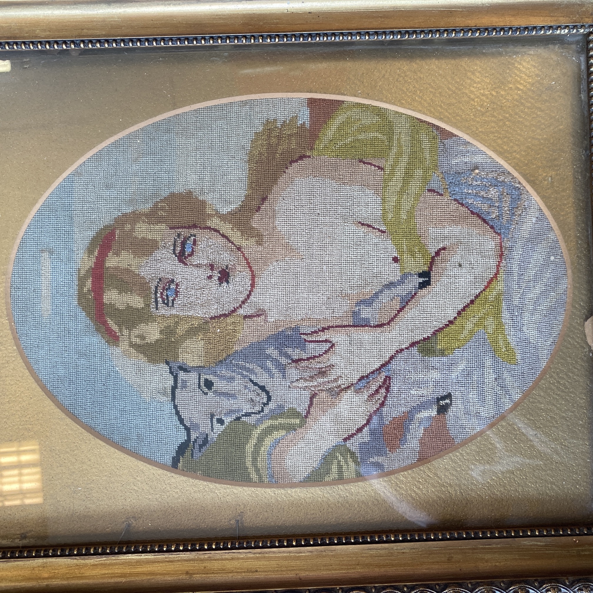 Antik képkeret tű gobelinnel, a keret hibátlan állapotban van, üveg is van hozzá.