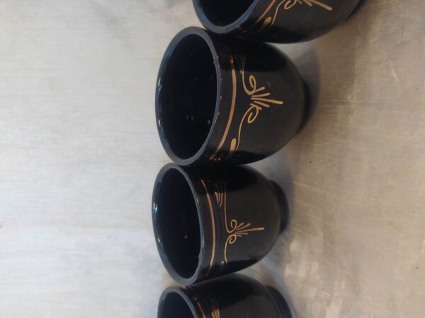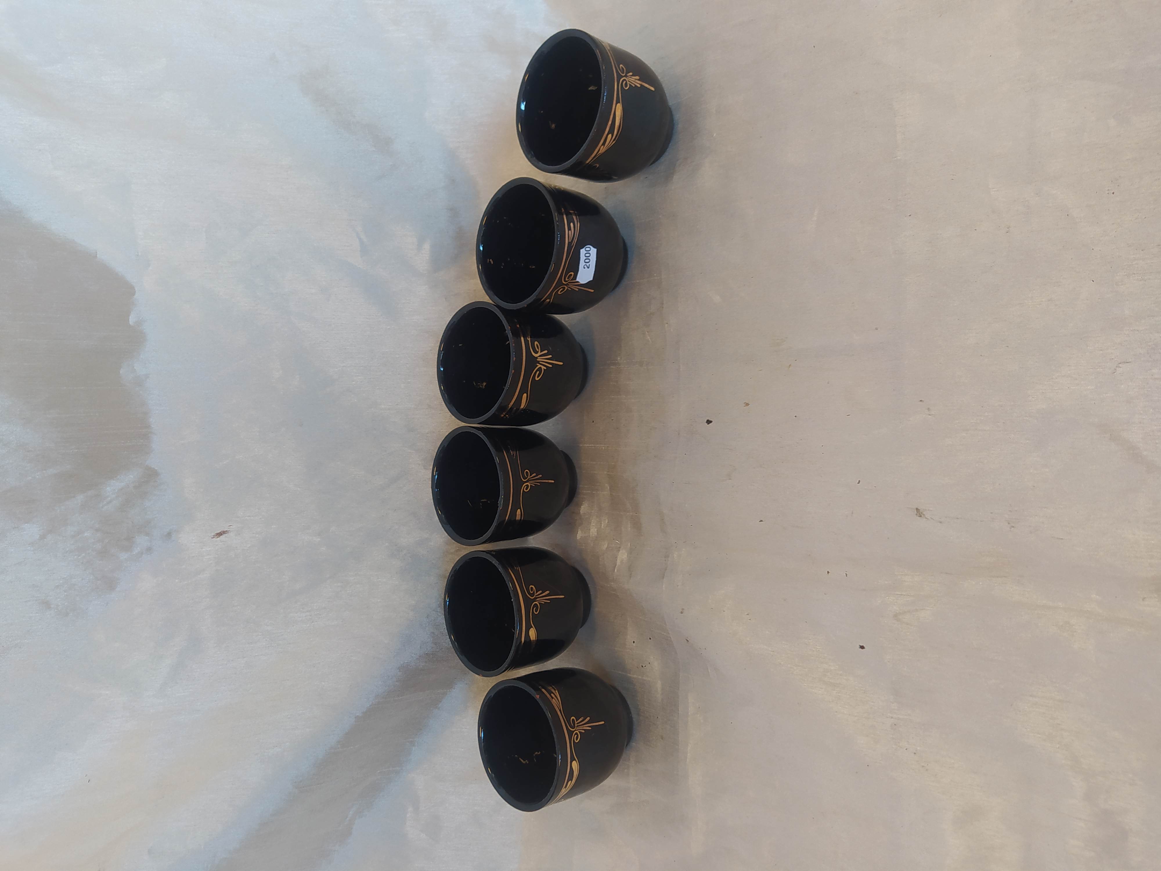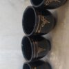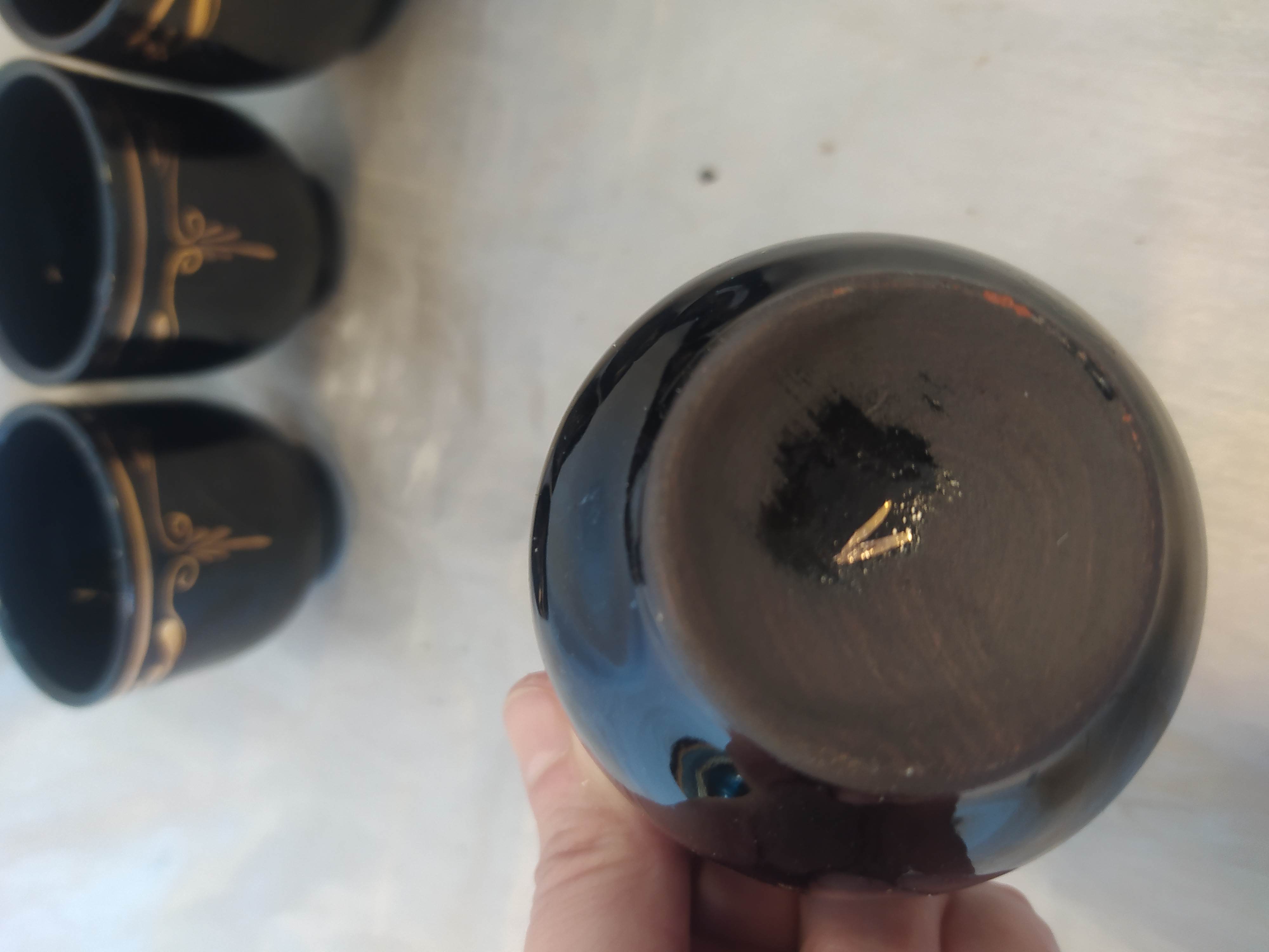 Antik kerámia csésze, fekete mázzal, arany díszítéssel, alján jelzéssel.