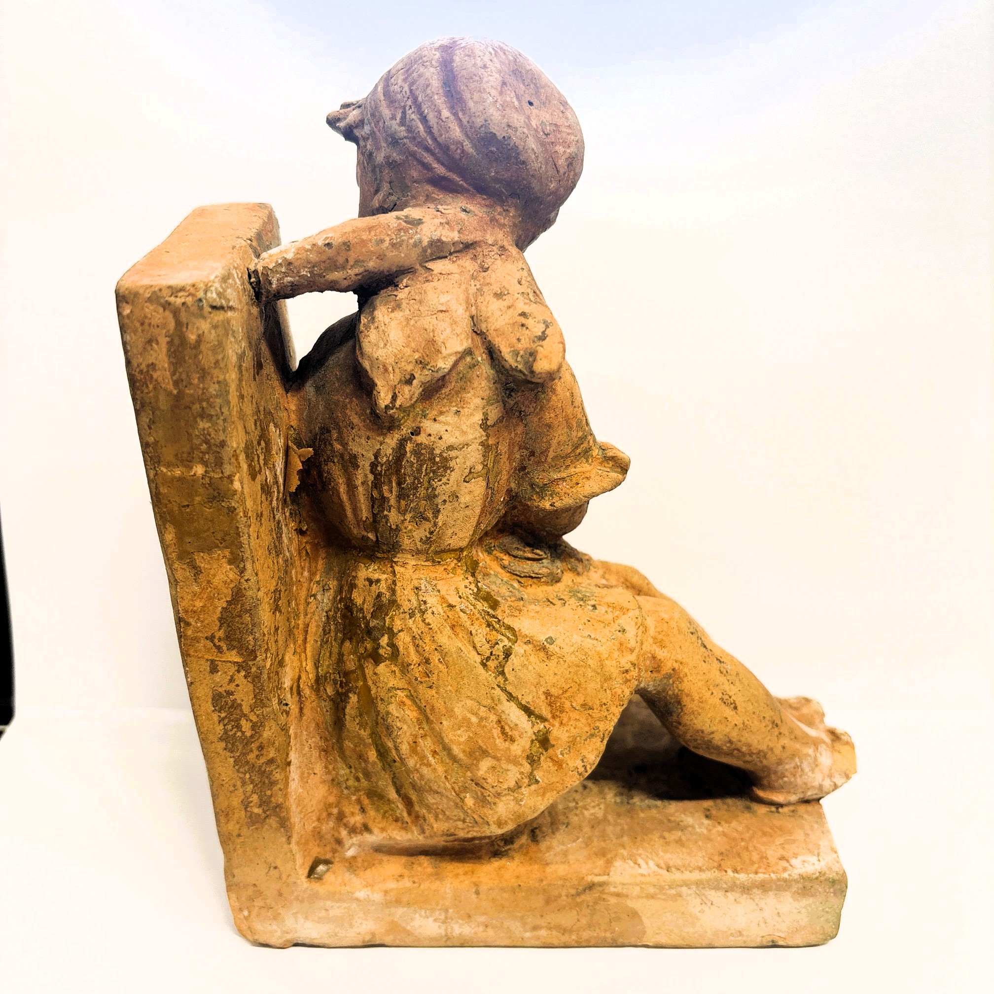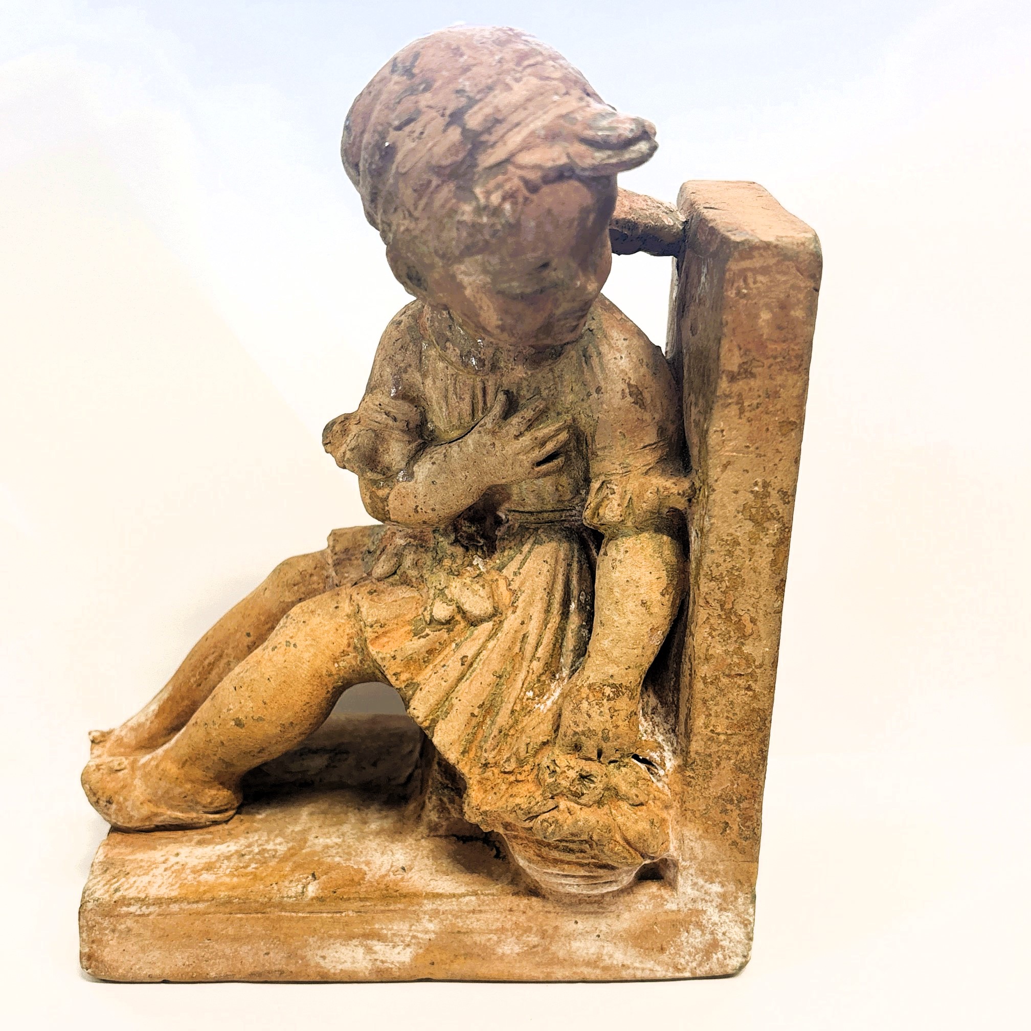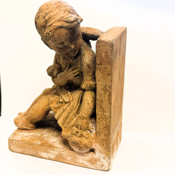 Antik kerámia/ terrakotta könyvtámasz, kislány szobor, a képen látható állapotban, 14×20 cm