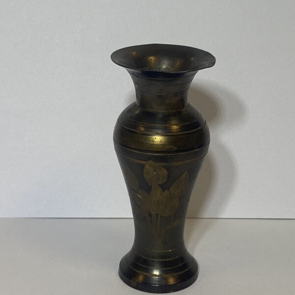 Antik mini réz váza, oldalán virág díszítéssel. Képen látható.