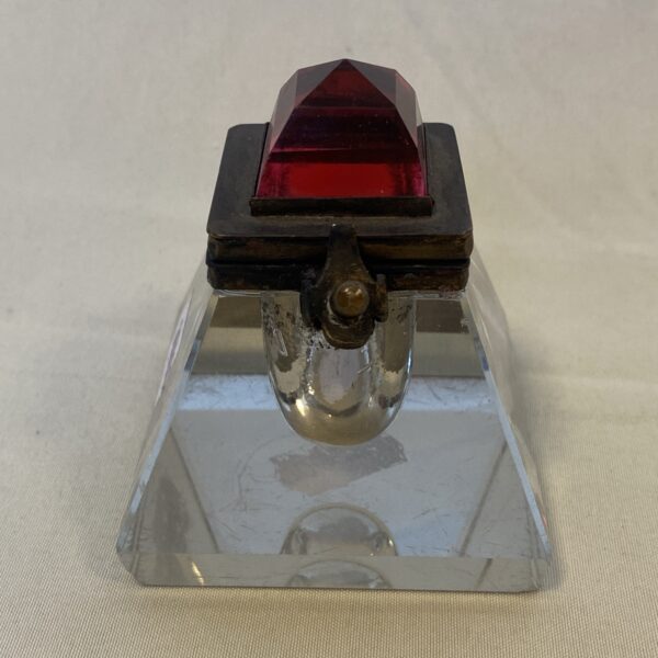 Antik üveg tintatartó, réz tetővel, színezett üveg díszítéssel. Képen látható állapotban.
