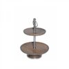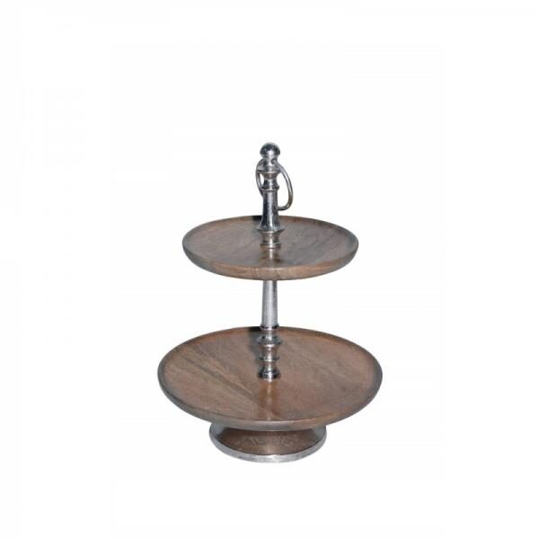 Magas minőségű, fából készült emeletes kínáló tál, melynek az alsó része 27 cm, felső része 20 cm átmérőjű. Fa talpának köszönhetően masszívan áll az asztalon. Dekoratív fém fogójának köszönhetően könnyen áthelyezhető. Családi ünnepekkor, rendezvényeken vagy baráti összejöveteleken is használható aprósütemények, muffinok, édességek vagy sós sütemények felszolgálására. Ezenkívül a finger food kedvelőinek is ajánljuk, hiszen az apró falatok kínálására is tökéletes termék.