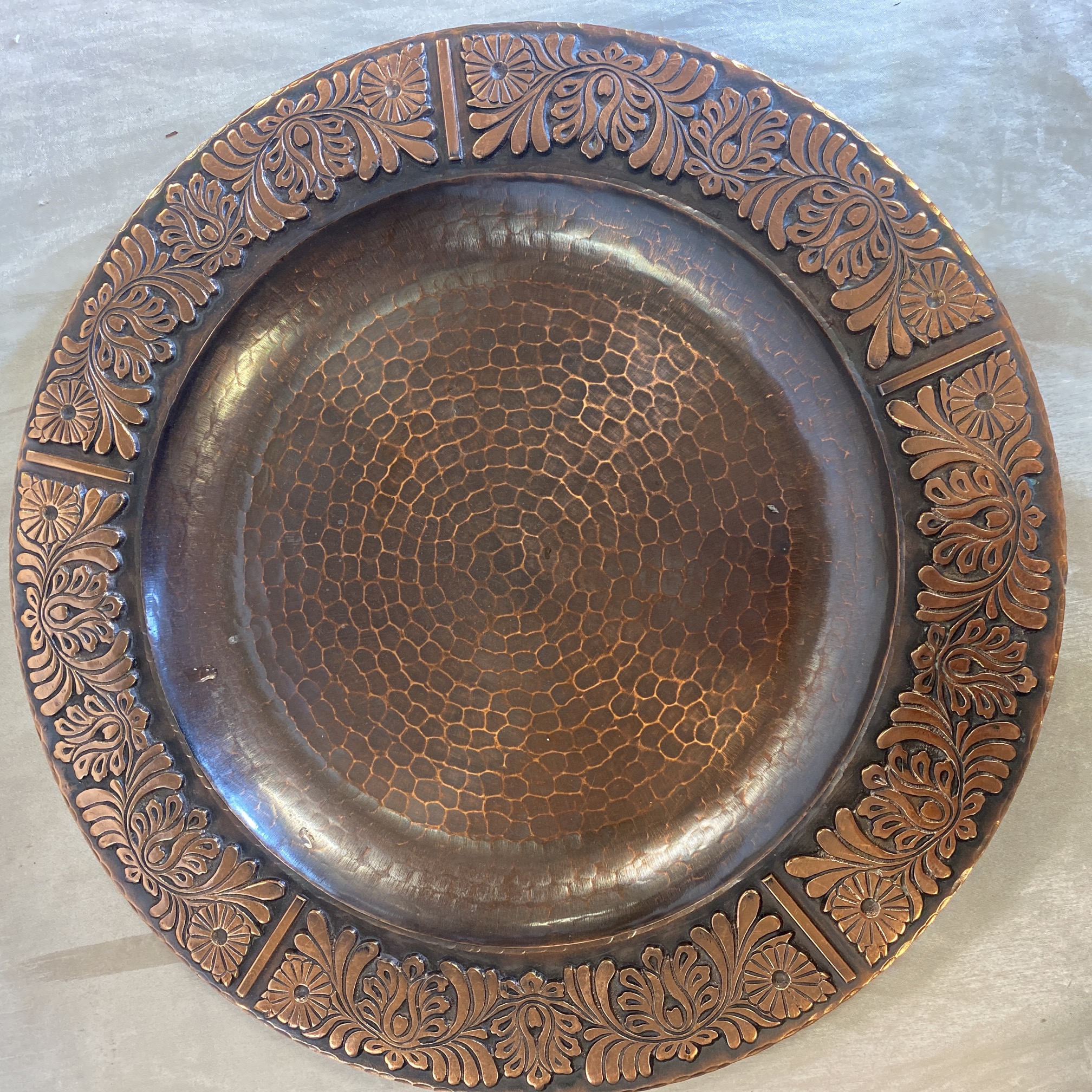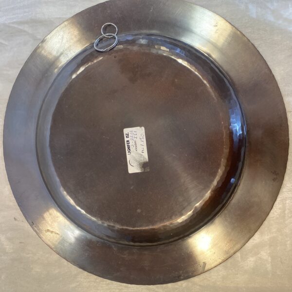 Iparművészeti réz dísztányér, egyedi díszítéssel, nagyon szép állapotban!