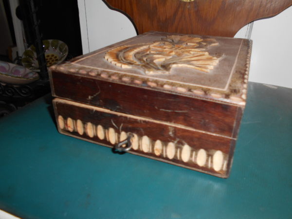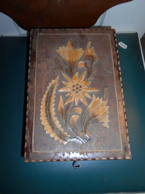 Ékszeres ládika, díszdoboz. Anyaga fa. Faragással díszített.