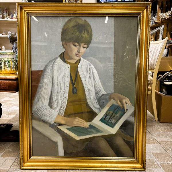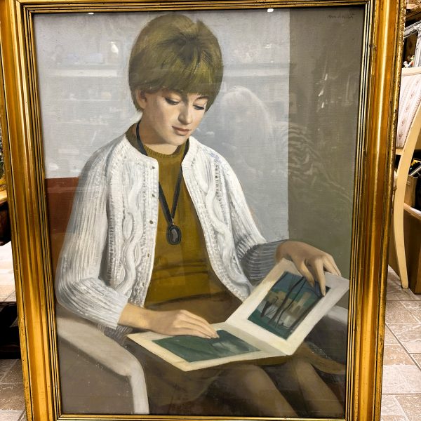 Mácsai István (1922 – 2005) festőművész gyönyörű Képcsarnokos alkotása “Olvasó Lány” címmel, nagy méretű, hibátlan állapotú olajfestmény, eredeti arany színű hibátlan keretében. 92×70 cm, jelezve jobbra fent és hátulján a Képcsarnokos cimkéjével. 1966-os megvásárlása óta egyetlen tulajdonosa volt, aki nagyon vigyázott rá.