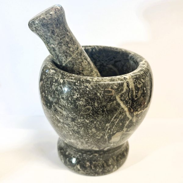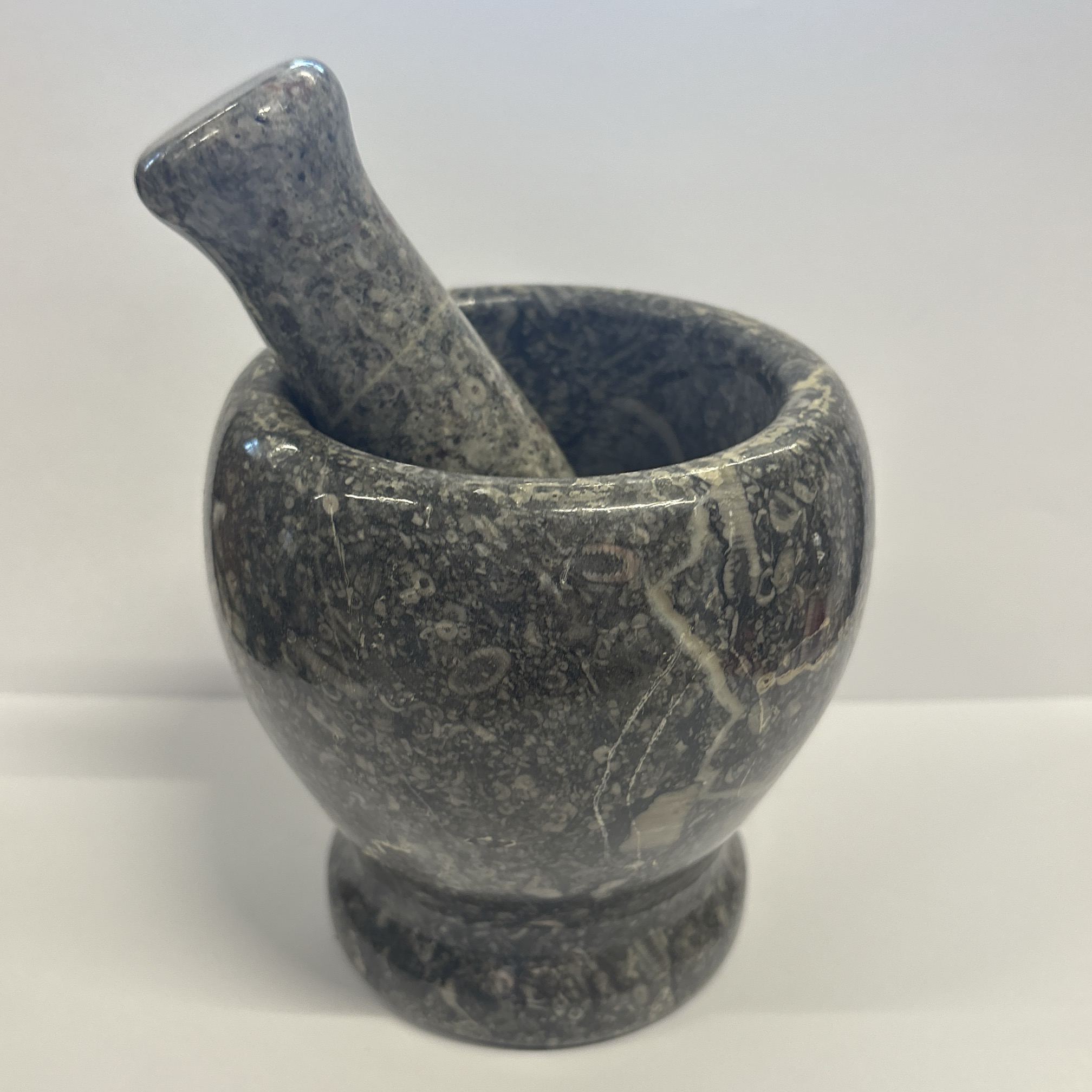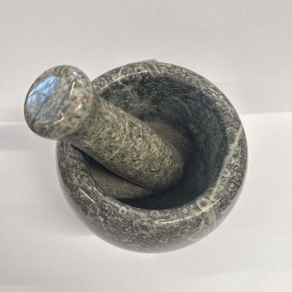 Antik márvány mozsár törővel, csorbulás mentes állapotban, mozsár 12 cm magas, 12 cm átmérőjű, törő 12 cm.