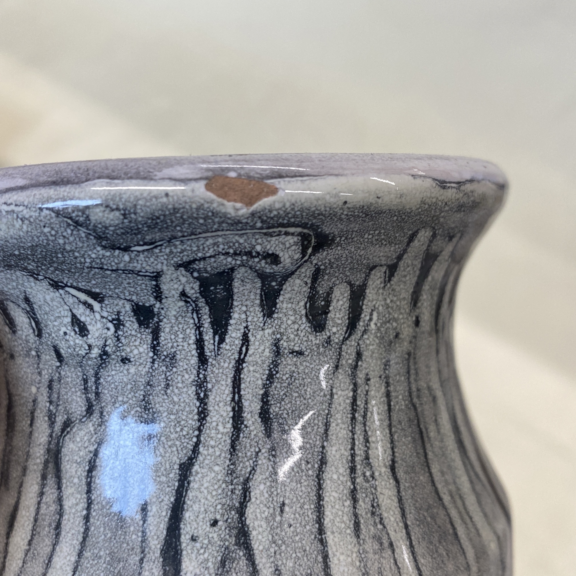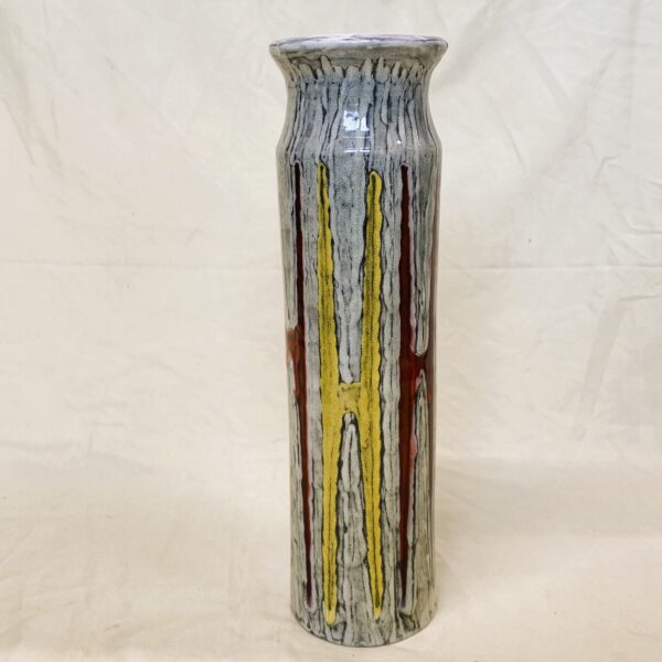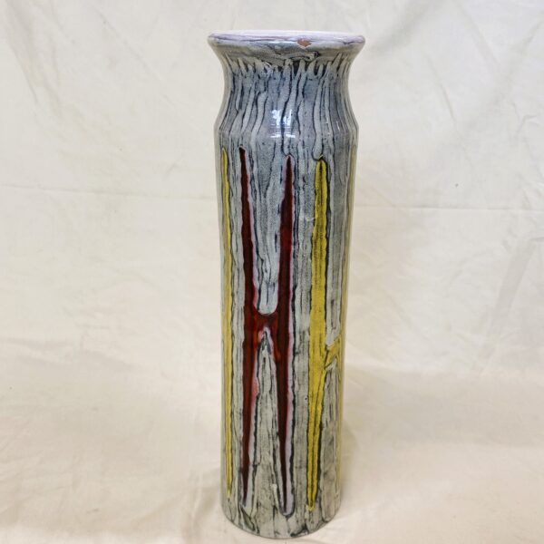 Nagy méretű iparművészeti kerámia váza, igazi retro stílus, jelzés nélkül, peremén gyártási hiba. 34 cm magas.
