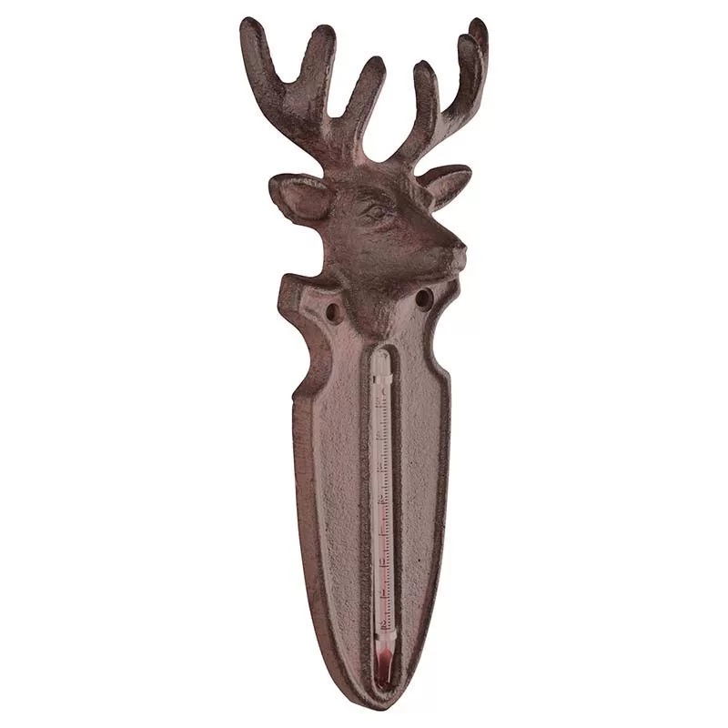 Öntöttvas hőmérő szarvasfej mintával. Időtálló anyagának köszönhetően kültéri használatra is egyaránt alkalmas, antik hatása és ötletes formája pedig dekoratív díszítőelemmé teszi. Öntöttvas jellegéből adódóan külső elhelyezés esetén, a korrózió megjelenésével egy patinásabb, rusztikusabb termék válik belőle. 23 cm