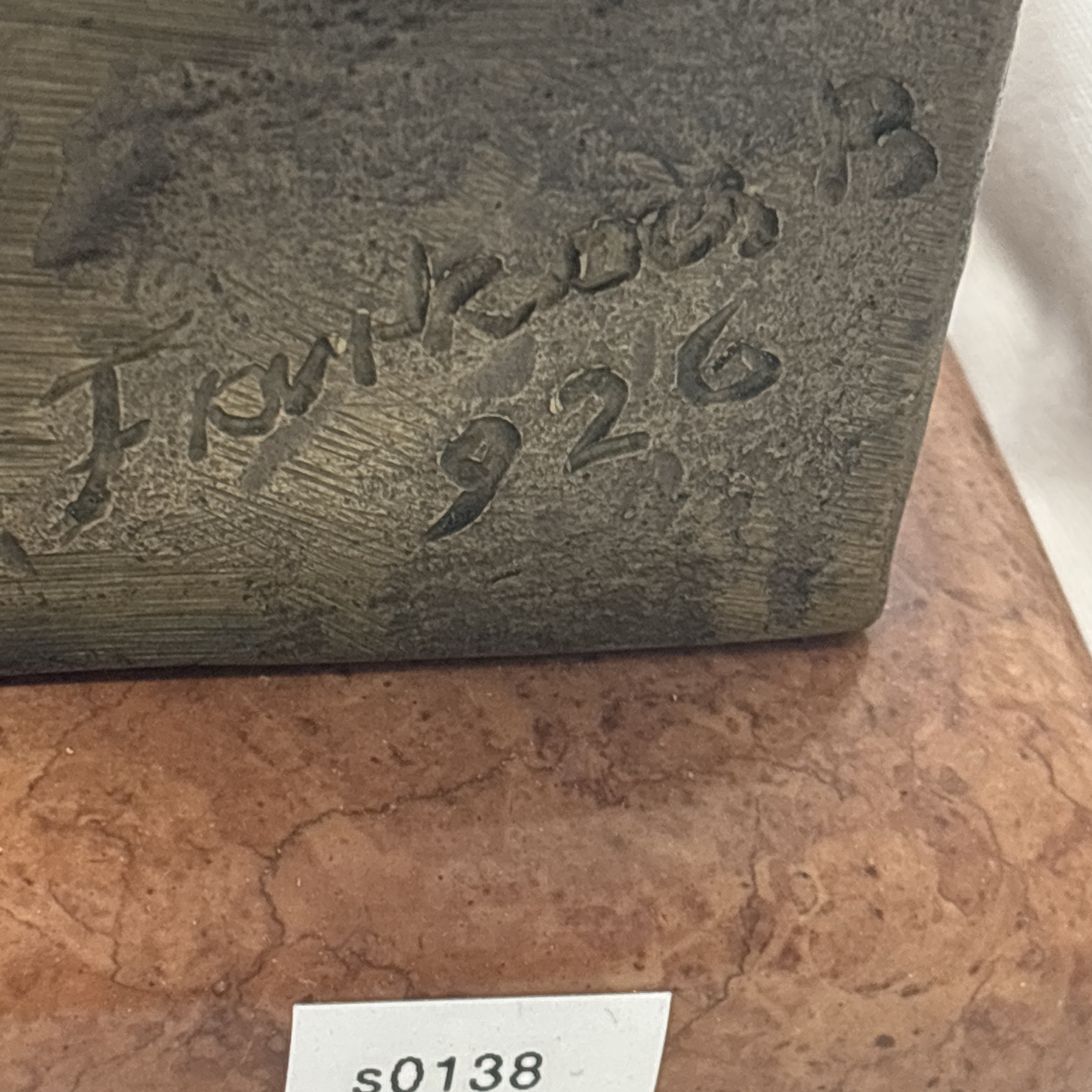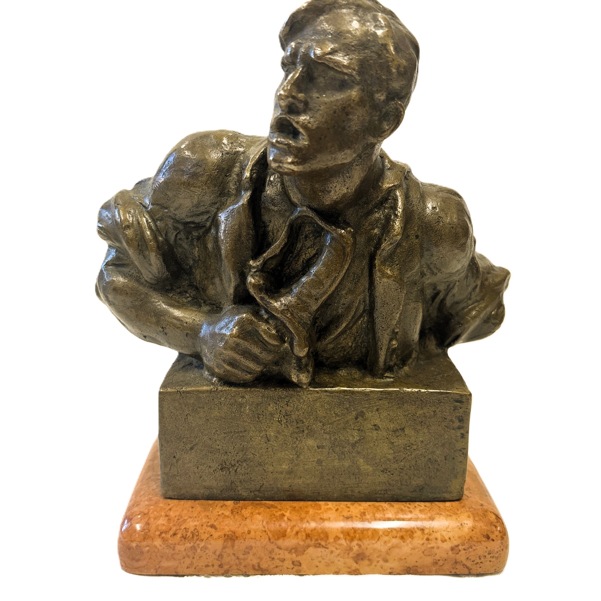 Pankotai Farkas Béla (1885 – 1945) szobrászművész alkotása 1926-ból, mely a Lentiben található I. Világháborús emlékművének egy részletét ábrázolja. Tömör bronz, márvány talapzaton, közel 13 kg! 27×25 cm, 28 cm magas. Igazi gyűjteményi ritkaság! Jelzett, pesti aukciósházból származik. Az eredetiségét szakértő igazolta.