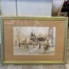 kép, képkeret, lakásdekoráció, Tájkép házzal arany keretben.