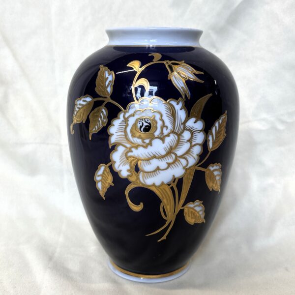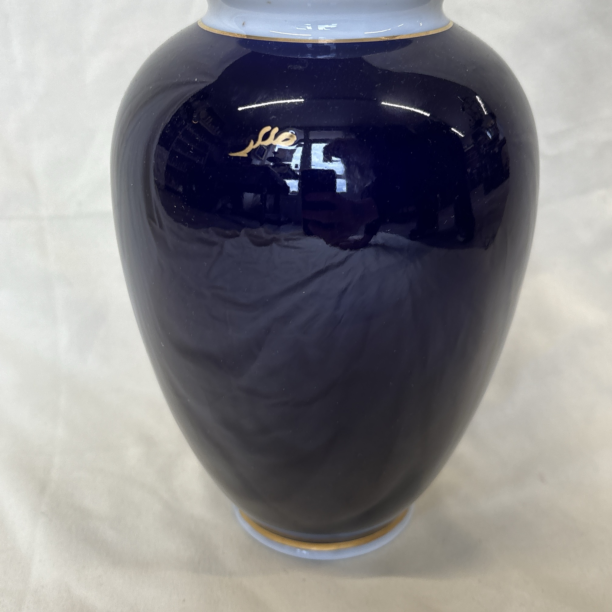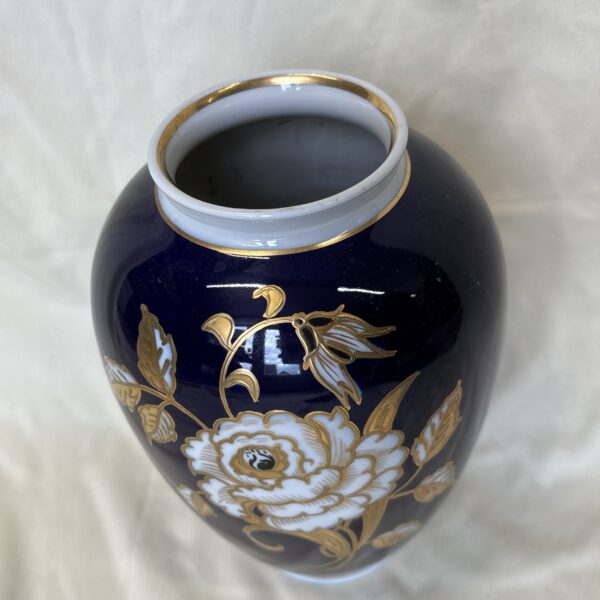 Gyönyörű, kézzel festett és aranyozott wallendolfi kobalt kék váza hibátlan állapotban, nagy méretű, alján jelzett, 21 cm magas, 13 cm átmérőjű.